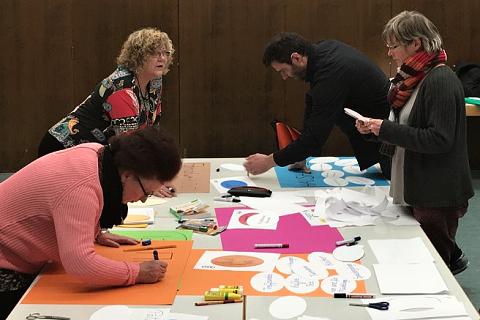 Daher trafen sich am 4. Februar einige Mitglieder des Arbeitskreises, um die Informationstafeln vorzubereiten. Alle Stichworte zu den Aufgaben und Themengebieten des Arbeitskreises wurden auf farbige Unterlagen geklebt, die dann an dem Infoabend aufgestellt werden.