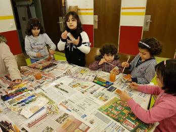 Wie immer, hatten die Kinder auch an diesem Nachmittag die Möglichkeit, eine Kleinigkeit zu basteln. 4 Mädchen aus der Konfirmandengruppe hatten sich eine nette Bastelei überlegt und unterstützten die Kinder beim Malen, Ausschneiden und Kleben. Die Erwachsenen nutzen die Zeit zum Austausch und um viel Neues von den anderen Kulturen zu erfahren.
