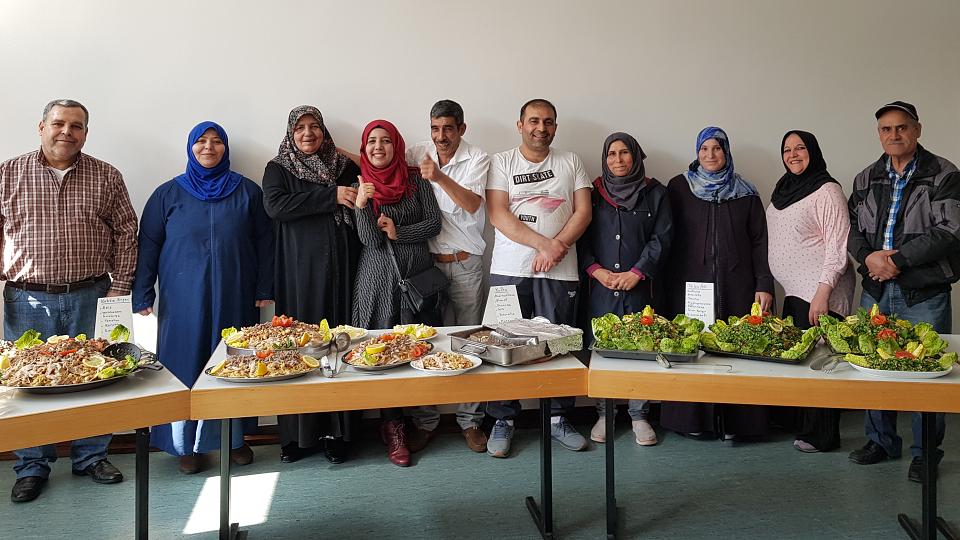 Um 13.30 Uhr war es soweit; die Gäste durften sich ihre Teller füllen. Die Auswahl fiel schwer, denn alles war herrlich angerichtet und duftete lecker. Und natürlich wollte man von allem etwas versuchen! Wann bietet sich denn die Gelegenheit, typisch arabische und türkische Gerichte zu kosten. Oft sind die Spezialitäten in den Urlaubsgegenden schon „eingedeutscht“ und in Syrien herrscht noch immer Krieg; dorthin sind derzeit keine Urlaubsreisen möglich.