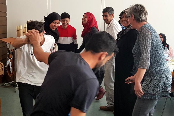 Nachdem das Büffet geplündert war und sich alle über den vollen Bauch strichen, tönte plötzlich arabische Musik durch den Saal. Die Geflüchteten tanzten temperamentvoll und luden auch die Gäste dazu ein, mitzumachen.