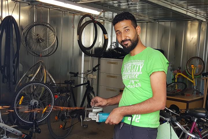 Der eine Helfer ist Abdulrahman, ein junger Mann aus Syrien und der zweite auch noch fast jugendliche Unterstützer heißt Atobaran und kommt aus Eritrea. Sie beide haben Herrn Klein anfangs oft über die Schulter geschaut und sehr schnell mit großer Begeisterung mitangepackt. Beide haben in ihren Heimatländern in Handwerksberufen gearbeitet und brachten also schon viel Erfahrung mit. Herr Klein hat sich über die Jahre ein gutes Konzept erarbeitet, wie er die gebrauchten Fahrräder, die nicht immer im besten Zustand sind, wieder instand setzt.
