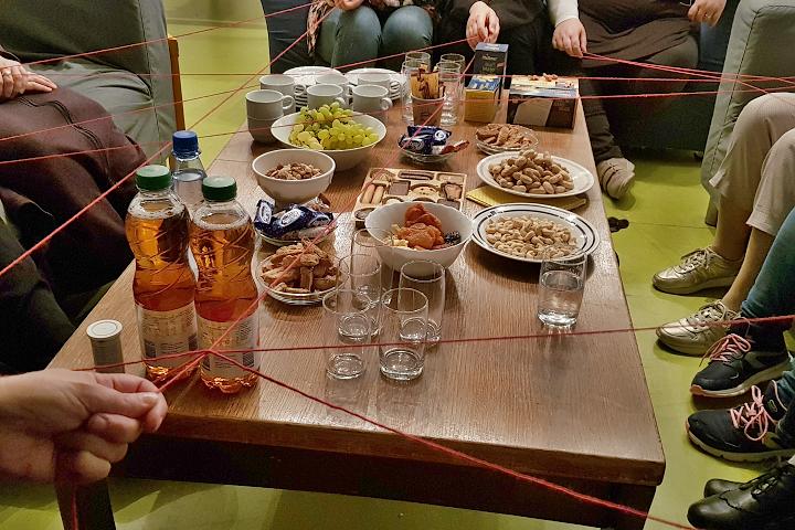 Der Abend begann mit einer kleinen Vorstellungsrunde, bei dem sich die syrischen Frauen mit ihren nun schon ganz guten Deutschkenntnissen ohne Hilfe vorstellen konnten. Gern wurde der Faden von der nächsten Frau aufgenommen und es entwickelte sich sehr schnell ein lebendiger Austausch über Länder- und Kulturgrenzen hinweg. Zum Schluss bildete das weitergegebene Wollknäuel ein alle verbindendes Netz, das sinnbildlich die verschiedenen Erzählstränge zeigte.