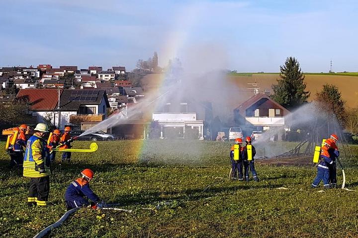 Aber bald schon war das Martinshorn aus Reudern zu hören und auch das Oberboihinger Feuerwehrauto kam zügig beim „Brand“ an. Die Jugendfeuerwehrtruppen beider Orte schlossen flink die Schläuche an und konnten bald schon mit dem „Wasserlöschen“ beginnen. Sie brachten das Feuer schnell unter Kontrolle und wurden von den vielen Zuschauern mit reichlich Applaus belohnt.
