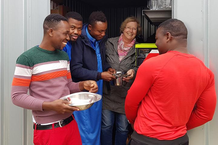 Jeder Togolese bekam einen Topf und einen Löffel. Hier war Frau Heiland streng, weil einfach derzeit nur so wenig von diesen wichtigen Dingen vorhanden ist. Die Syrer, Türken und Gambier, die auch um Geschirr fragten, erhielten am heutigen Tag nichts, da sie zuerst die Neuankömmlinge versorgen wollte.